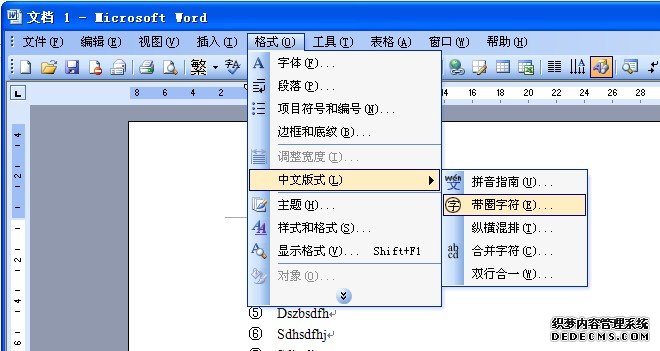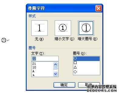 選定數(shù)字后(如22),單擊工具欄上的"格式"按鈕-中文版式,打開"帶圈字符"對話框,在對話框中,有3個選擇項。